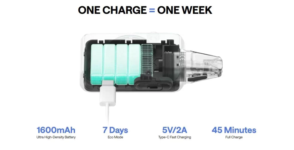 - Get back to vaping in no time; it fully recharges in just 45 minutes using USB Type-C (5V/2A).